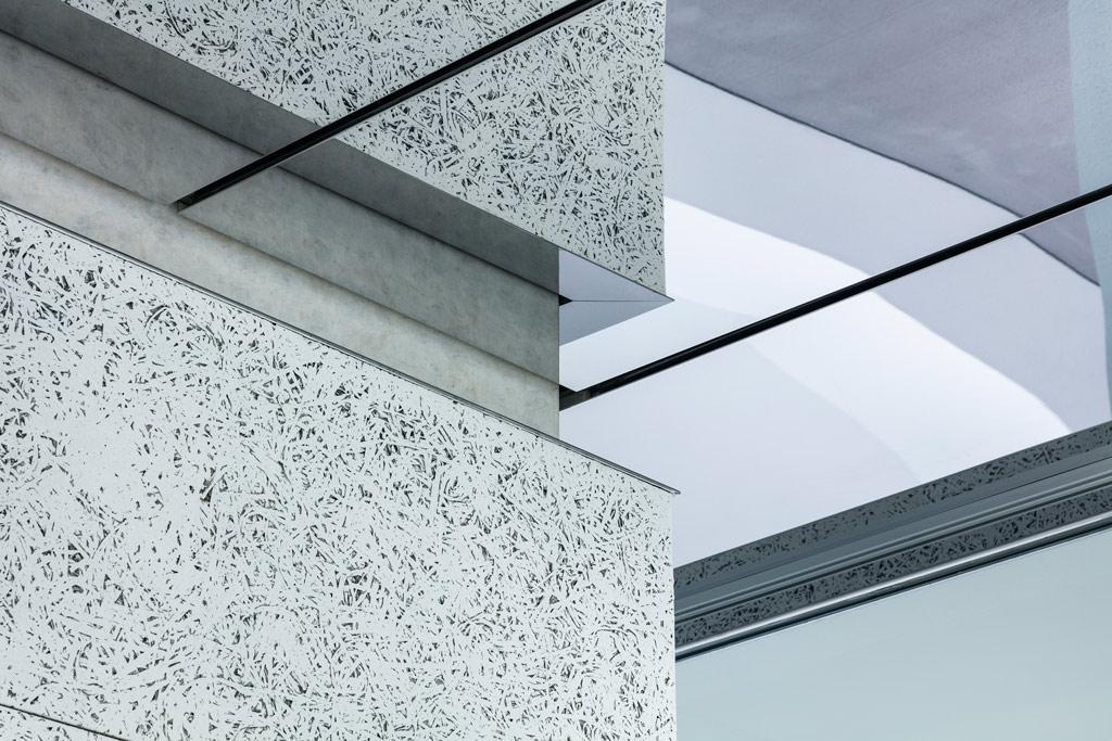 石貼りの床や、鏡面の天井など、平滑な素材が使われている空間に対して、素材感のある木毛セメント板で壁面と柱を覆った。展示壁としても機能する同素材を、白く塗装することでギャラリーとの一体感を持たせ、石張り目地の既存モジュールをそのパネル割と合わせ、空間全体を統合した。ビル受付の案内板や点在する立て看板などのサインについても、空間に合わせて白く塗装した木毛セメント板やOSB板を使い一新した。コーヒーを置いて座れるよう座面を広くとった門型のベンチは、家具メーカー・カリモクの技術を活かし、無垢材を円形断面に加工して、手触りの良いディティールに仕上げることで、空間に柔らかさを与えている。また、カフェの外装グラフィックは様々なデザイナーによって定期的に一新される。